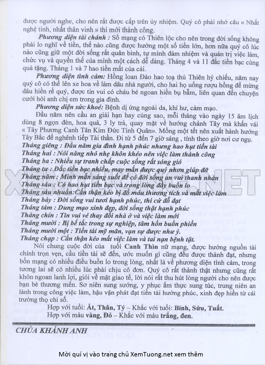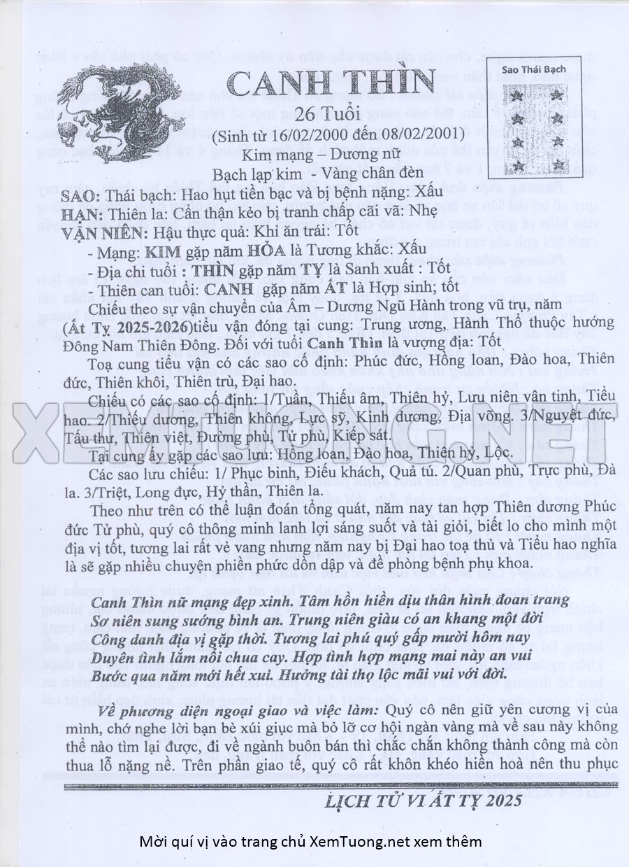 Tử Vi Năm Ất Tỵ 2025 mạng nữ CANH THÌN