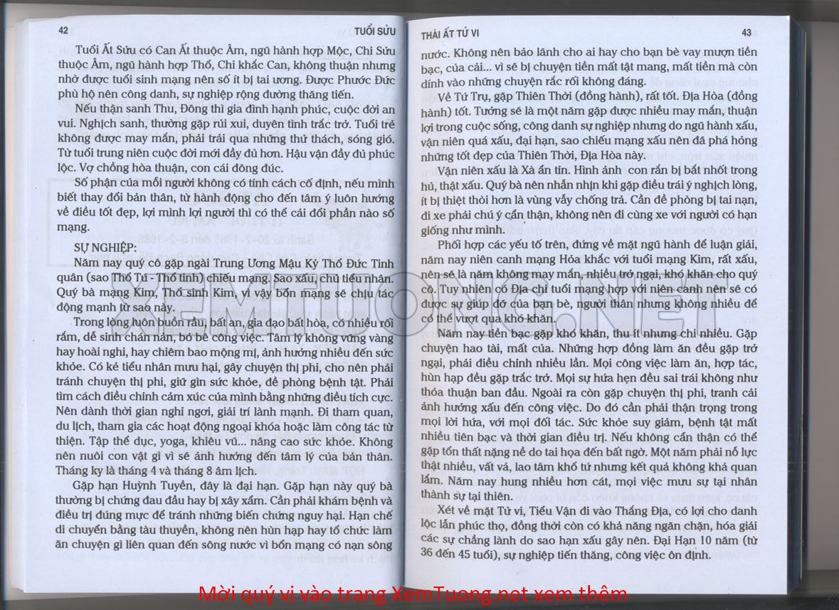 (Lưu ý: Thái Ất Tử Vi được chúng tôi scan từ sách, do đó mỗi tuổi sẽ có nhiều trang, quý vị xem xong hãy nhấn vào trang tiếp theo để xem hết phần tuổi muốn xem. Nếu quý vị xem bằng điện thoại thì hãy kéo qua lại để xem phần bị khuất.)