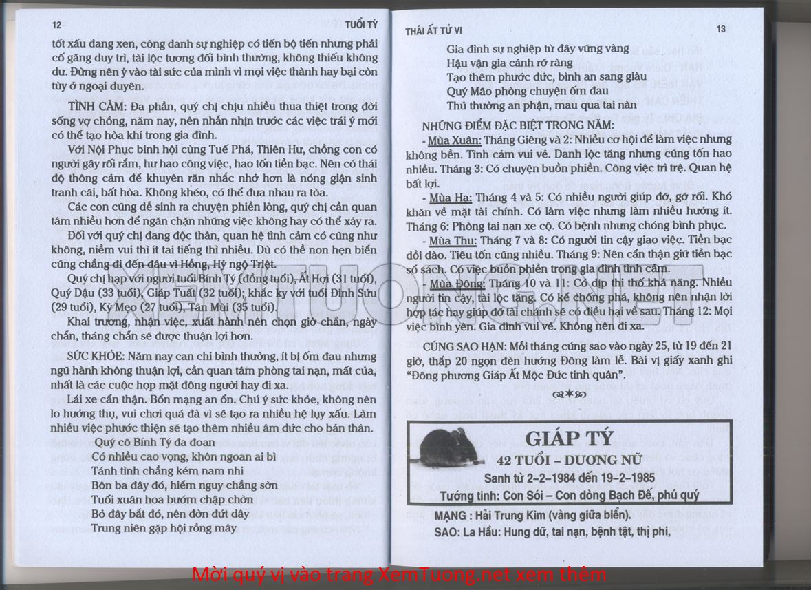 (Lưu ý: Thái Ất Tử Vi được chúng tôi scan từ sách, do đó mỗi tuổi sẽ có nhiều trang, quý vị xem xong hãy nhấn vào trang tiếp theo để xem hết phần tuổi muốn xem. Nếu quý vị xem bằng điện thoại thì hãy kéo qua lại để xem phần bị khuất.)
