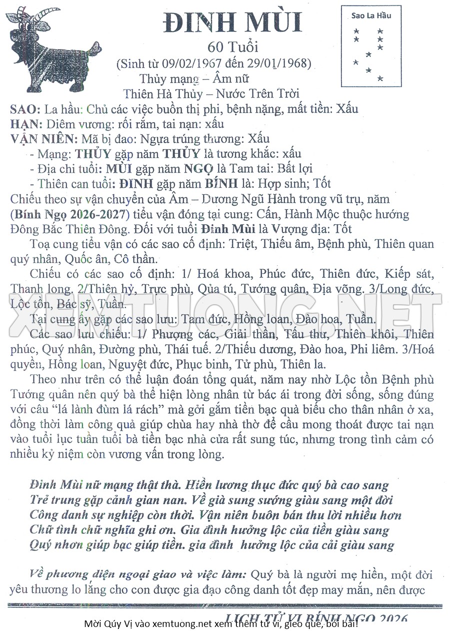 Tử Vi Năm Bính Ngọ 2026 mạng nữ Đinh MÙI