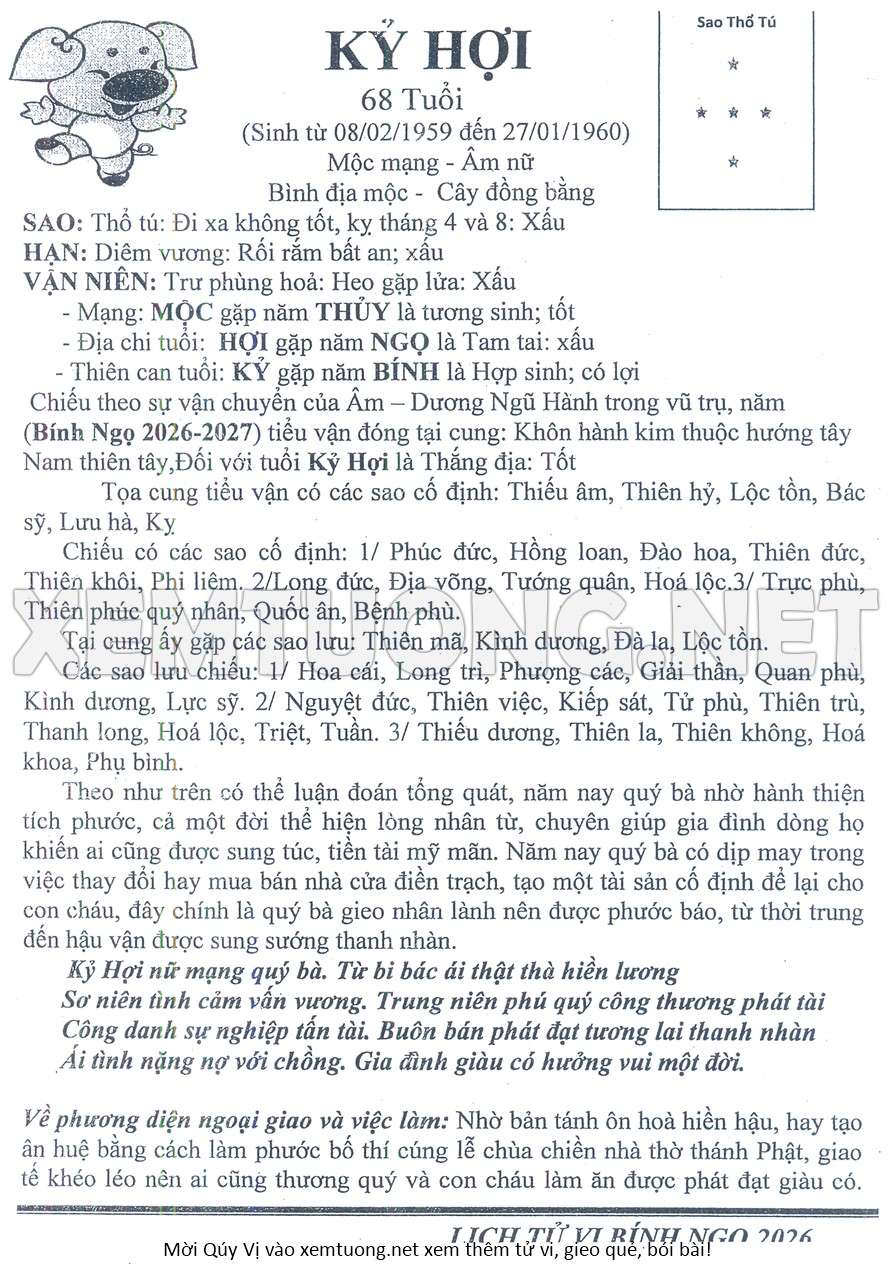 Tử Vi Năm Bính Ngọ 2026 mạng nữ KỶ HỢI