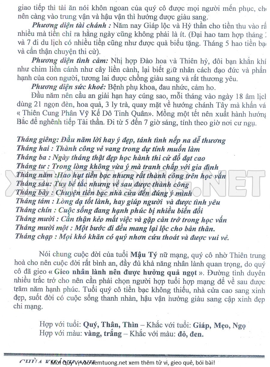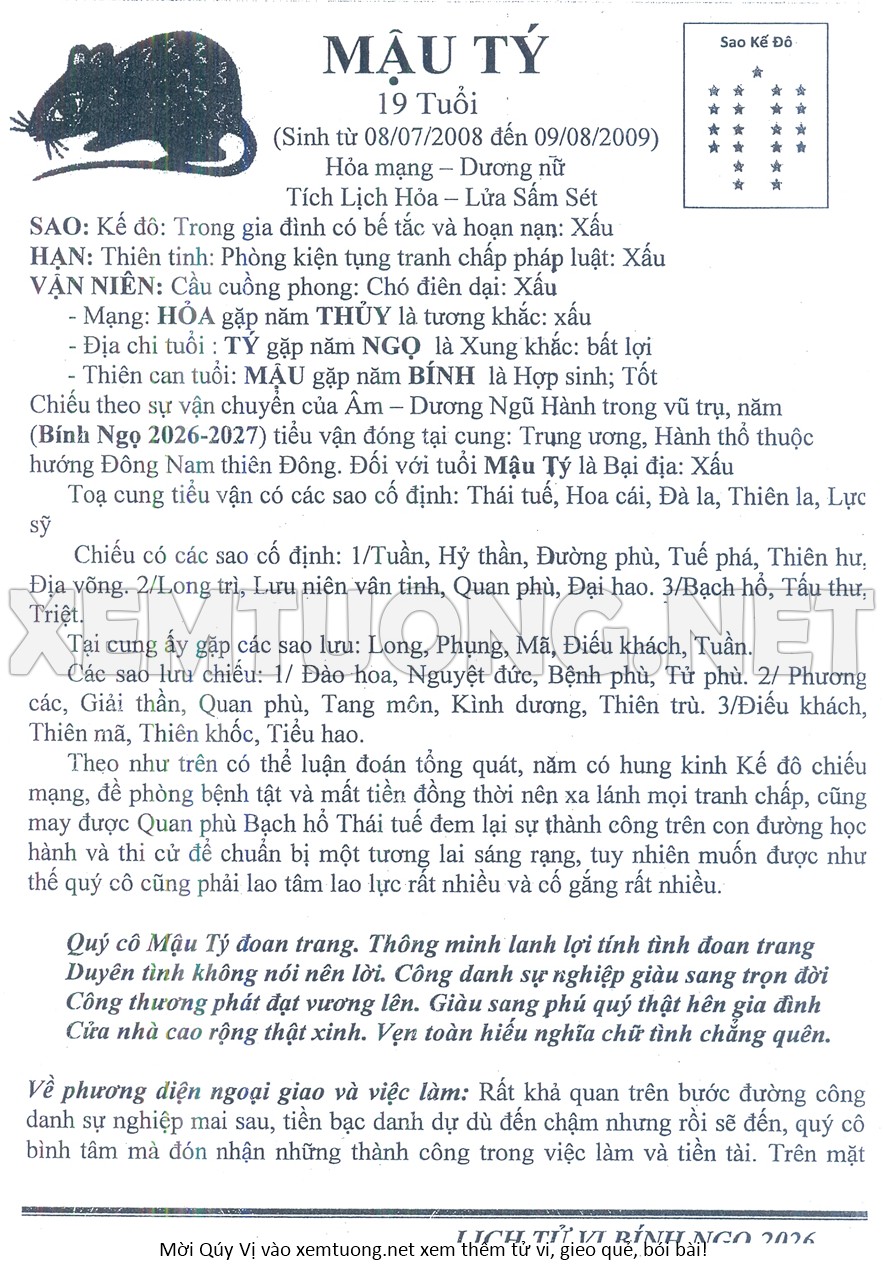Tử Vi Năm Bính Ngọ 2026 mạng nữ MẬU TÝ